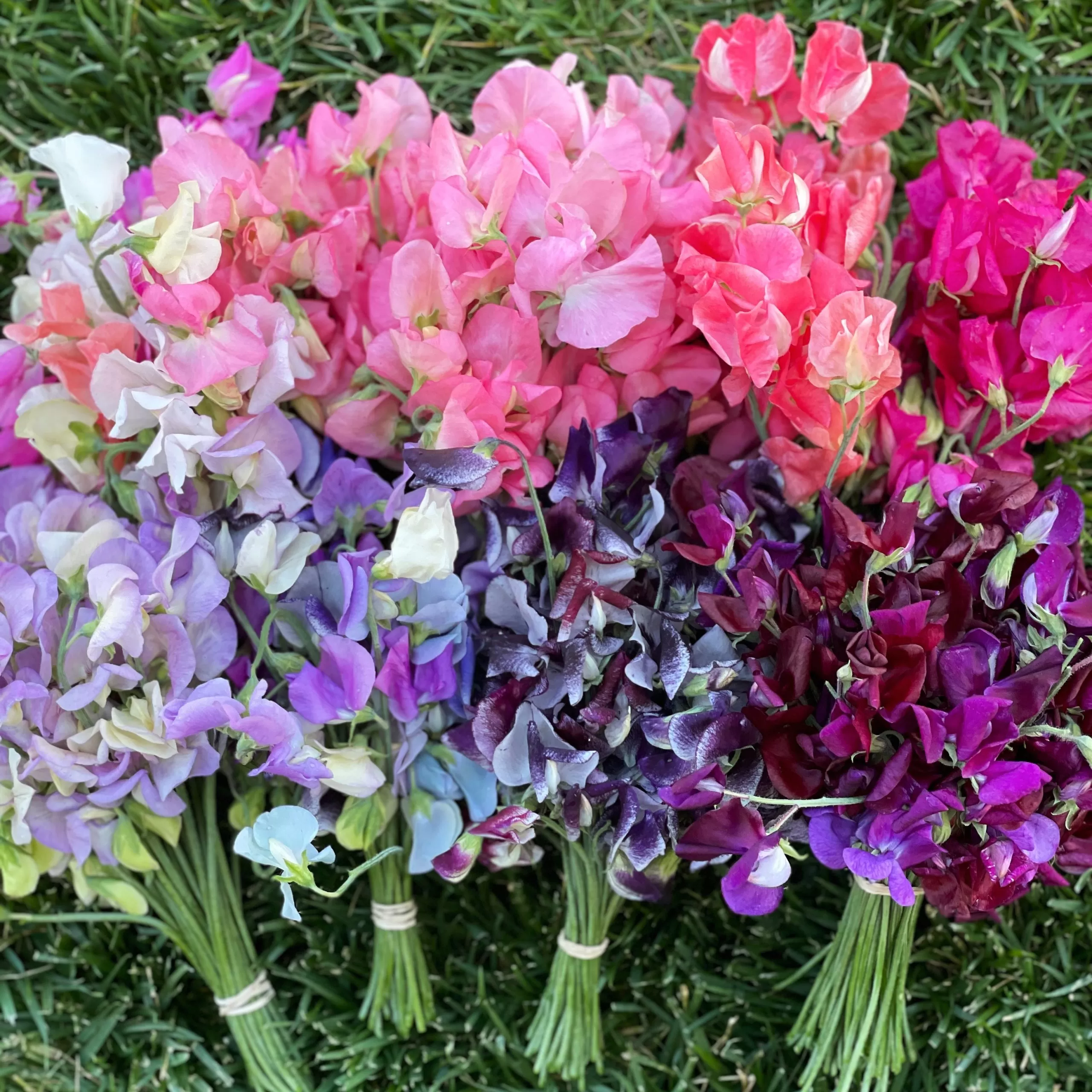 Pile of harvested sweet pea flowers on the ground, showcasing their delicate blooms
