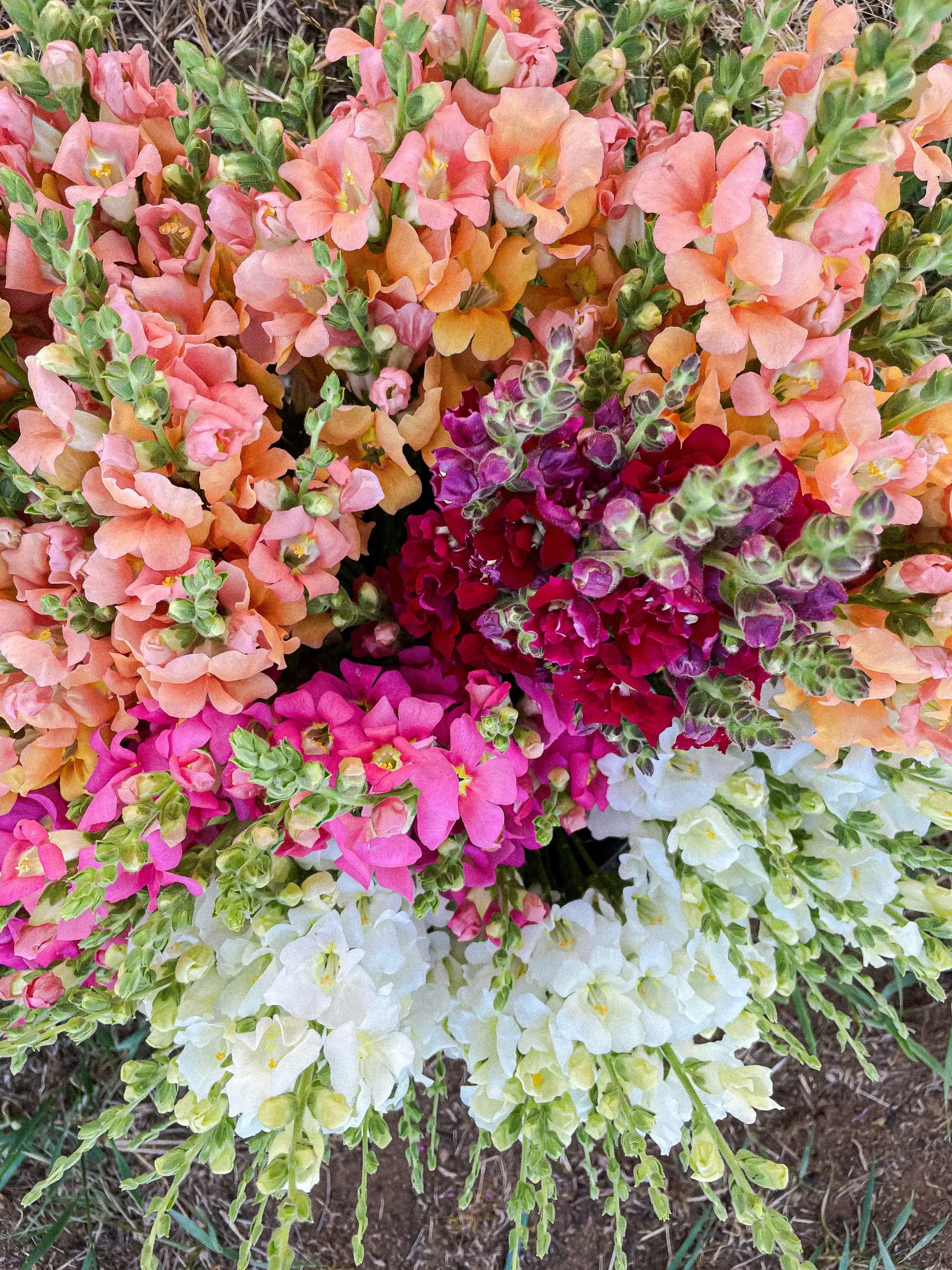 Bucket overflowing with tall snapdragon flowers in various shades, grown from seed