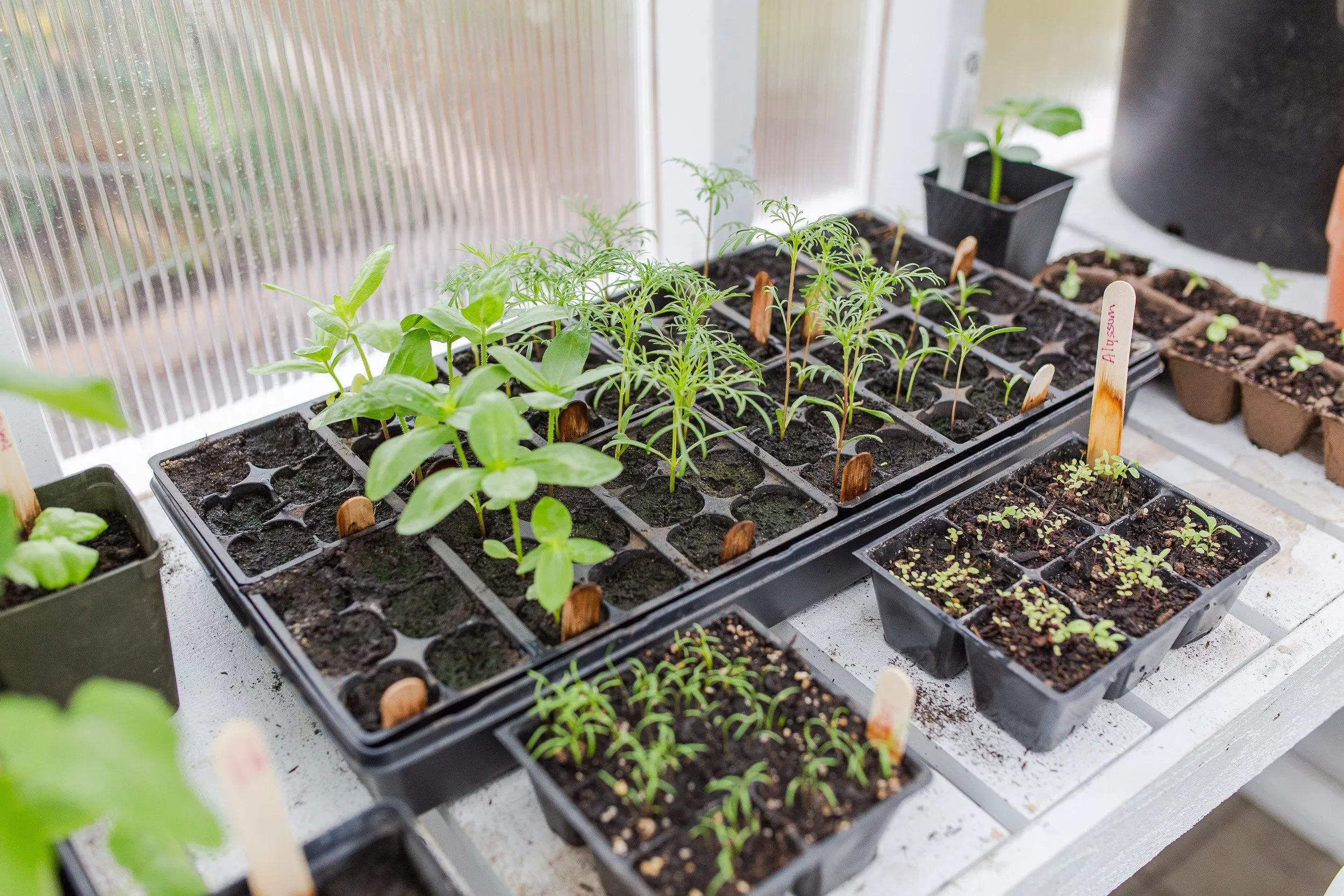 Close-up of trays filled with young flower seedlings under lights in a greenhouse