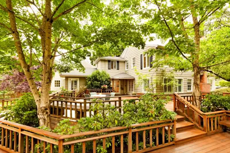 Möchten Sie einen wirklich einzigartigen und integrierten Wohnbereich im Freien? Entwerfen Sie Ihre Terrasse oder Ihr Deck so, dass es einen bestehenden Baum integriert. Einen ausgewachsenen Baum direkt durch Ihr Deck wachsen zu lassen, schafft ein atemberaubendes, immersives Erlebnis. Es fügt sofort Dramatik hinzu, spendet natürlichen Schatten und fördert eine tiefere Verbindung zur Natur, genau dort, wo Sie sich entspannen oder unterhalten.