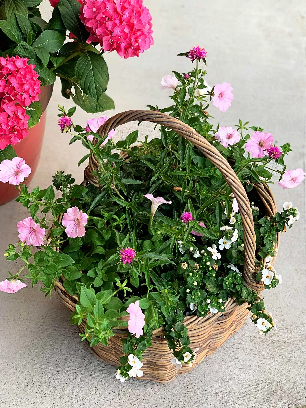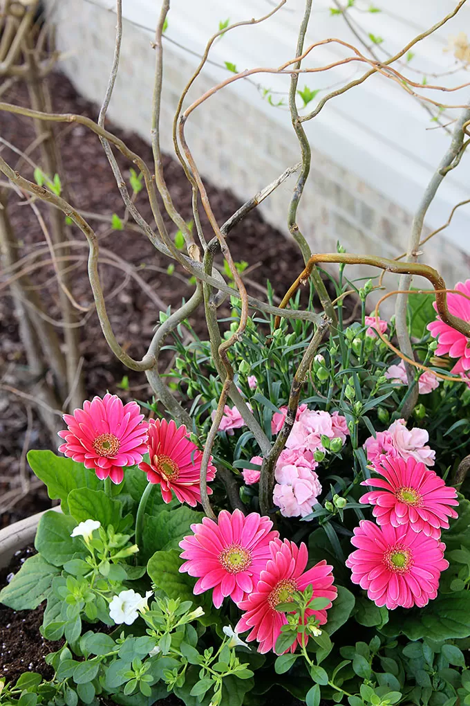 Calibrachoa, gerbera daisy and carnations in a flower garden planter.