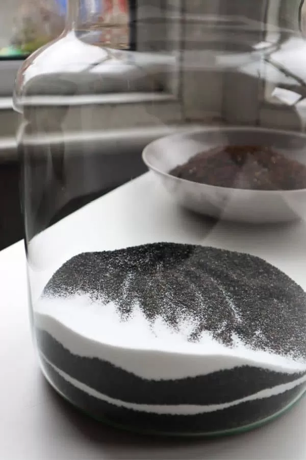 Foto: Geschichteter schwarzer und weißer Sand für Sand-Kunst im Terrarium.