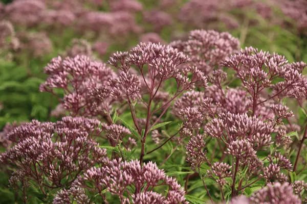 Para una exhibición realmente impresionante a finales de verano, considera el Eupatorio Purpúreo. Esta resistente planta perenne nativa puede alcanzar una altura imponente de 1.8 a 2.1 metros, lo que la convierte en un punto focal en cualquier jardín. También hay variedades enanas disponibles para espacios más pequeños. El Eupatorio Purpúreo cuenta con un hermoso follaje verde burdeos y grandes cabezas de flores de color púrpura blanquecino, que atraen a mariposas y abejas.