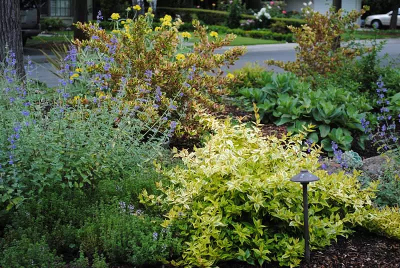 Vibrant no-lawn front yard garden featuring gold, chartreuse, lavender, and blue plants.