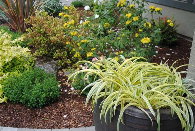 Una de las alegrías de un jardín sin pasto es la capacidad de atreverse con las elecciones de plantas. ¡No tengas miedo de usar colores vibrantes! Sin embargo, al igual que al pintar un cuadro, equilibrar los colores brillantes es clave. Si te atraen los colores cálidos como el dorado y el chartreuse, combínalos con contrapartes refrescantes como la lavanda y el azul.