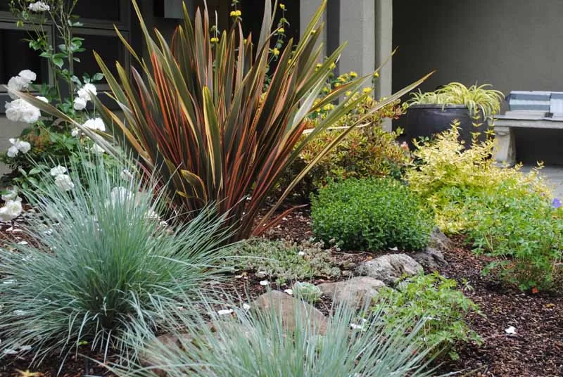 Helictotrichon sempervirensPhormium (a menudo cultivares de P. tenax o P. cookianum)Aquí es donde realmente puedes inyectar personalidad en tu diseño sin pasto. Elige plantas que ofrezcan follaje de color y textura interesantes, así como flores que atraigan insectos beneficiosos.
