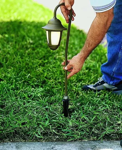 Imagen de primer plano de una persona instalando una luminaria de iluminación de paisaje al empujar la estaca en el césped, parte de la planificación de ideas de iluminación de jardines.