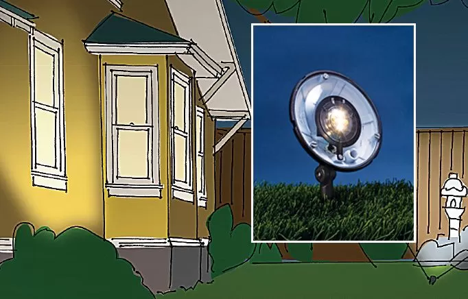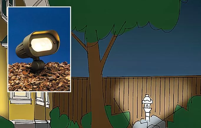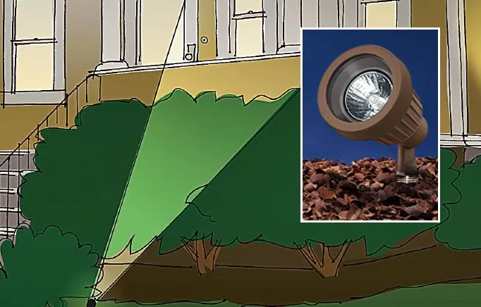 Dibujo que representa una luminaria compacta de luz de proyectil apuntando un haz enfocado a la pared de una casa para destacar detalles arquitectónicos, demostrando iluminación de acento.