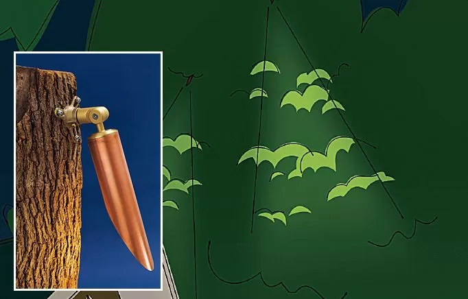 Dibujo que ilustra una luminaria de luz descendente montada en lo alto de un árbol, proyectando luz hacia abajo para crear un efecto de luz de luna en el suelo o el follaje.