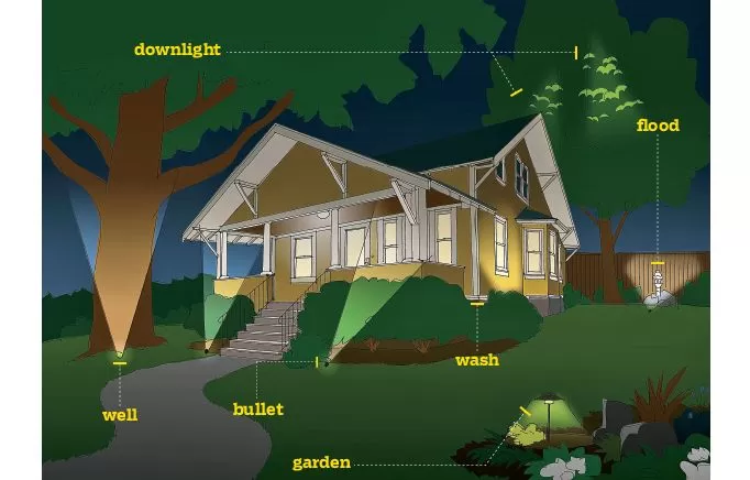 Ilustración que representa una casa y el paisaje circundante con varias técnicas de iluminación de bajo voltaje que iluminan senderos, árboles y características arquitectónicas.
