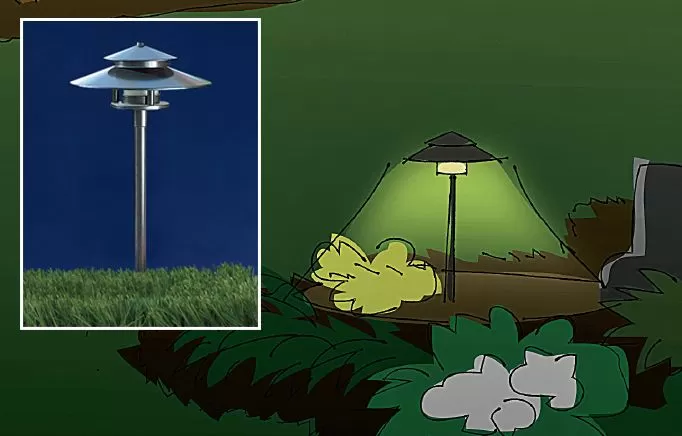 Dibujo estilizado de una luminaria de luz de sendero de jardín con un poste, proyectando un brillo hacia abajo para iluminar macizos de plantación y pasillos.
