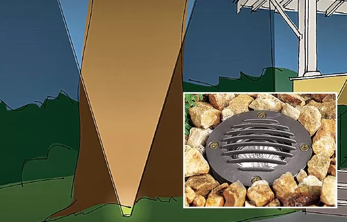 Ilustración que muestra una luminaria de luz empotrada en el suelo, proyectando un haz de luz hacia arriba para iluminar el tronco y la copa de un árbol.