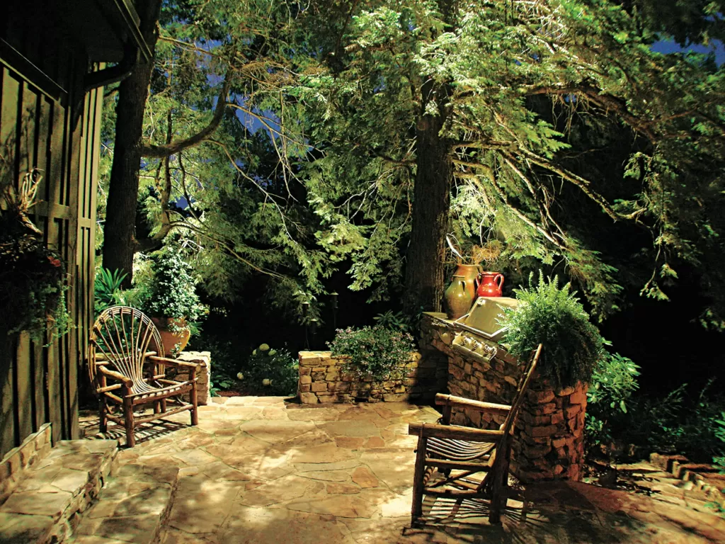 Un patio de piedra amueblado con sillas y una parrilla, iluminado de noche por iluminación de paisaje suave para crear un área de vida y comedor exterior acogedora.
