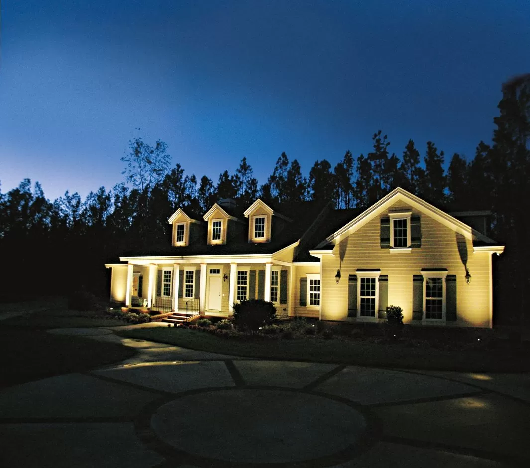 La fachada de tu hogar es la pieza central de tu paisaje, incluso de noche. Utiliza la iluminación para acentuar sus mejores características. Las “luces de proyectil” de haz estrecho son perfectas para llamar la atención sobre detalles arquitectónicos como columnas, frontones o mampostería única. Colócalas cerca de los cimientos y angúlalas hacia arriba. Para evitar un aspecto irregular, utiliza “luces de baño” más suaves entre estos puntos focales para proporcionar una iluminación suave y uniforme en las paredes, creando un aspecto estratificado y acogedor.