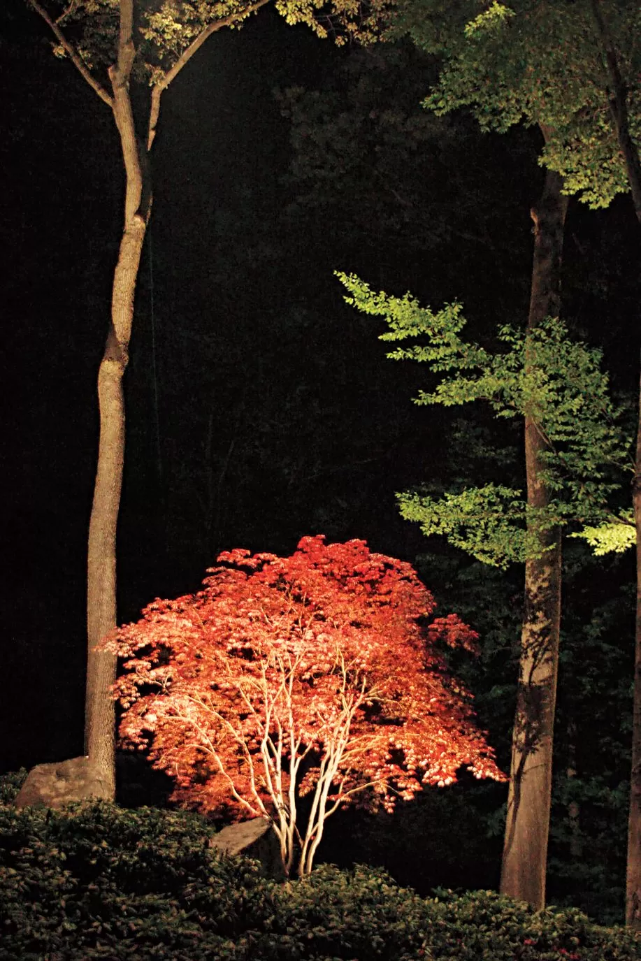 Un árbol otoñal con vibrantes hojas rojas dramáticamente iluminado desde abajo por luminarias de paisaje, mostrando cómo la iluminación realza la belleza de los árboles.