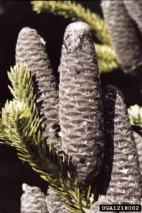 alt text: Balsam fir cones standing upright on a branch. Mature balsam fir cones have deciduous scales that fall away, leaving a central stalk.