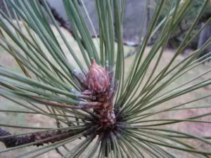 alt text: Close-up of red pine needles and buds, showing the characteristic two needles per fascicle and persistent sheath.