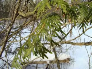 alt text: Northern white cedar foliage showing the scale-like, keeled needles characteristic of the cedar family.