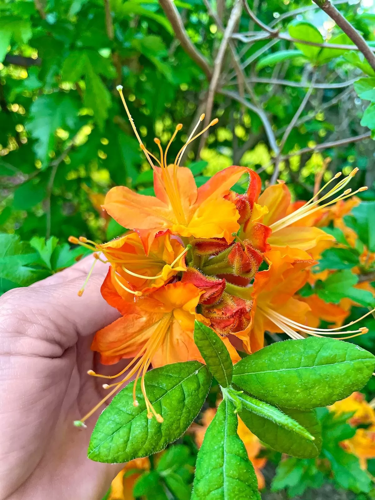 12 Bbam23 Juliewolfe1 orange azaleaVibrant orange azalea blossoms clustered together.