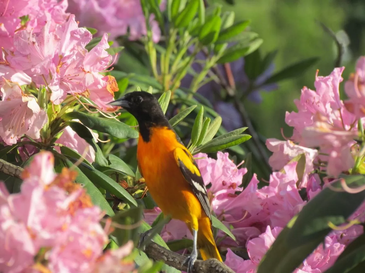 Baltimore orioleMale Baltimore Oriole perched on a blooming pink rhododendron bush.