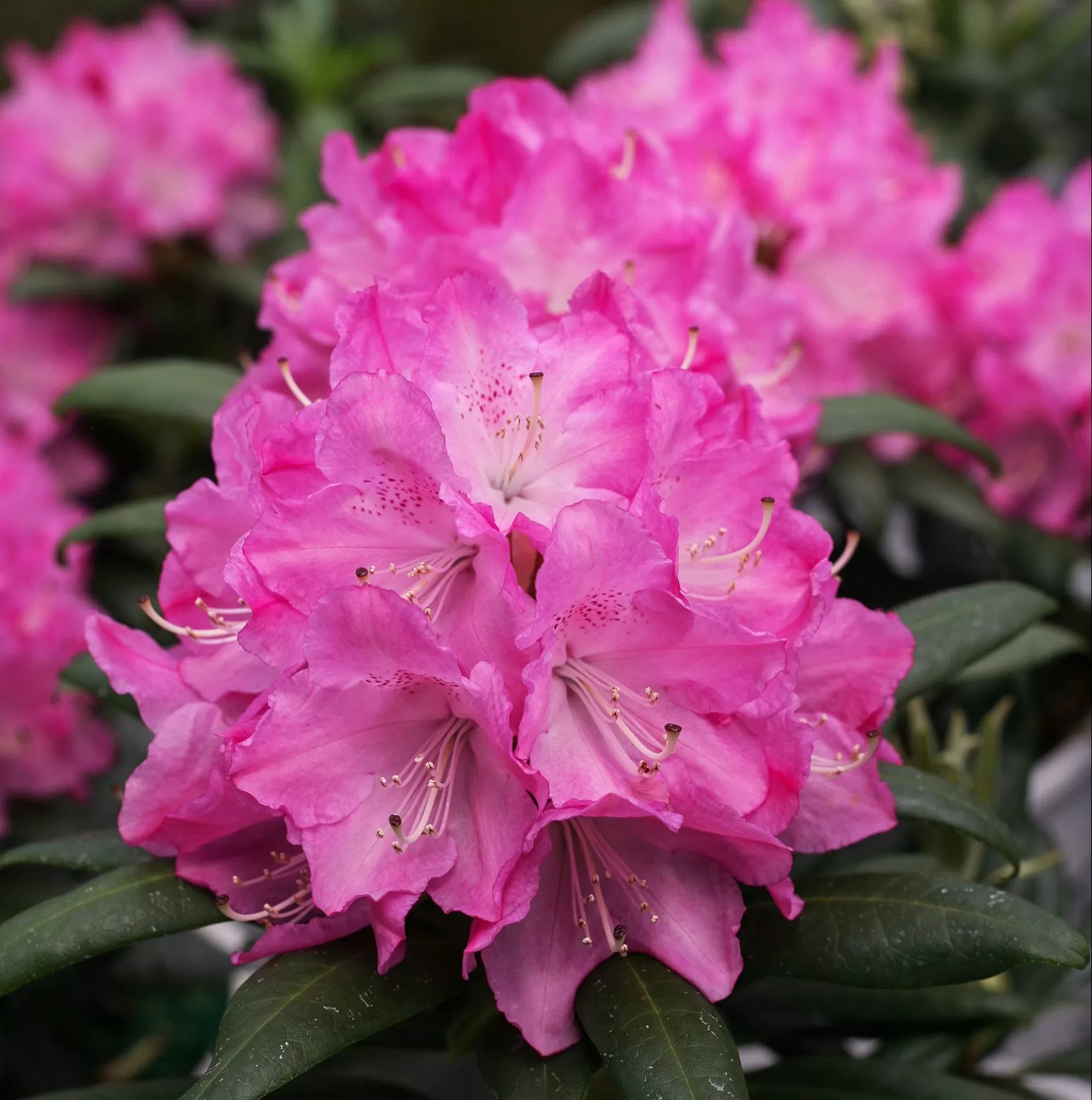 Dandy Man pink rhododendron blooms grow in clusters at the end of each plant.Clusters of striking pink flowers on a Dandy Man rhododendron shrub.