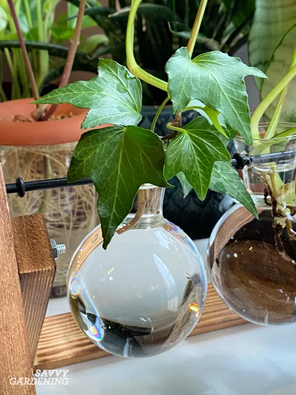 English Ivy cuttings thriving as water-only houseplants in a clear glass vase.