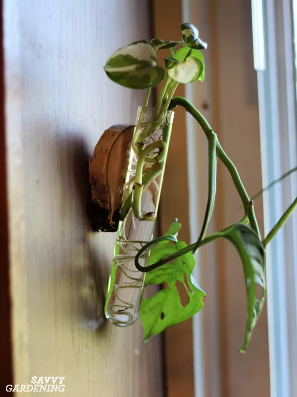 Golden Pothos and Monstera adansonii cuttings rooting in water in wall-mounted test tube propagation station.